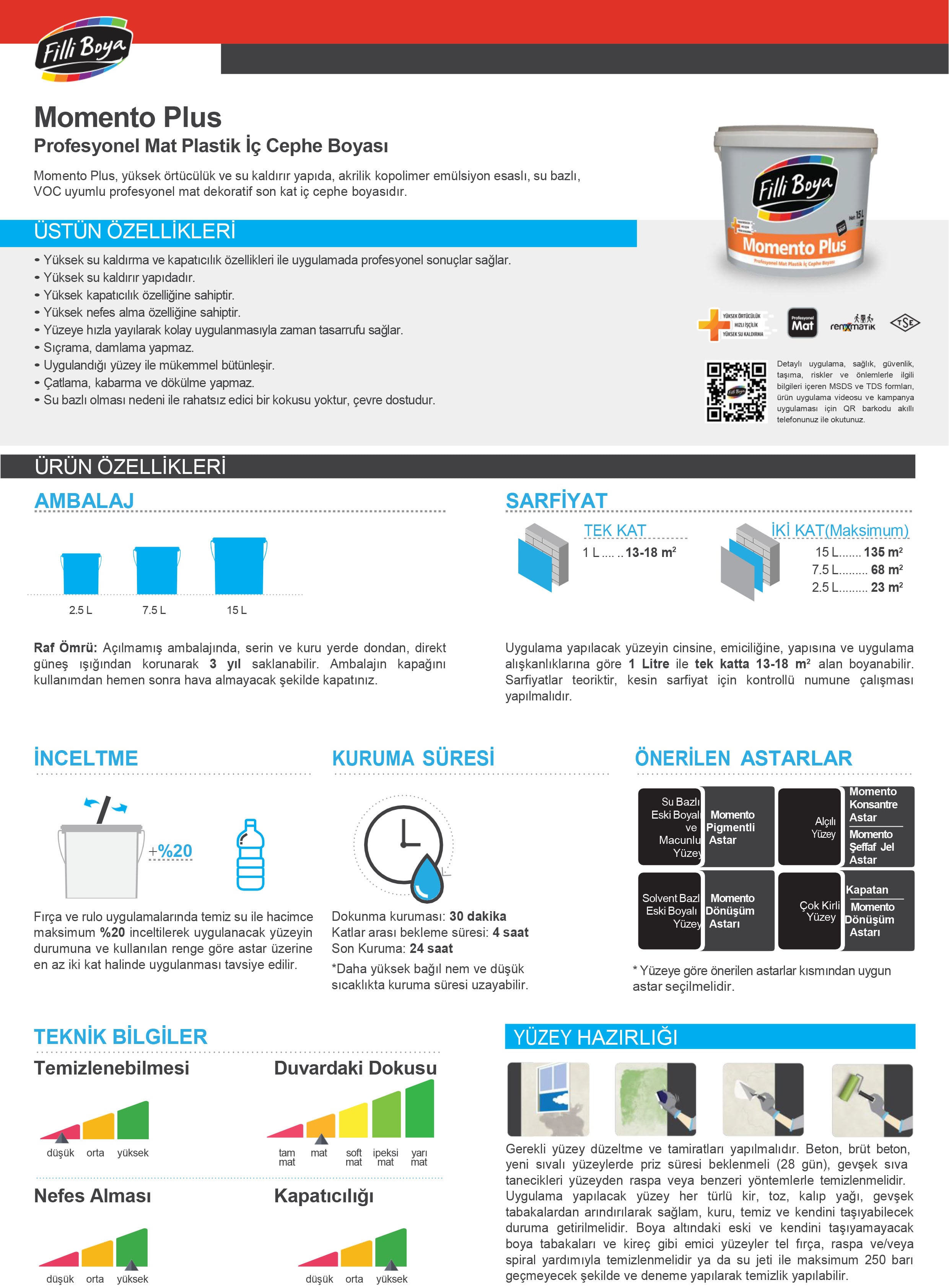 Yüksek nefes alma özelliğine sahiptir. Yüzeye hızla yayılarak kolay uygulanmasıyla zaman tasarrufu sağlar. Sıçrama, damlama yapmaz. Uygulandığı yüzey ile mü-kemmel bütünleşir. Çatlama, kabarma ve dökülme yapmaz. Su ile inceltilebilir, çevre dostudur. Uygulama sırasında rahatsız edici kokusu yoktur.Momento Plus, iç cephe eski-yeni boyalı/sıvalı duvar, alçı, macun, alçıpan, betopan, OSB, cam tekstili yüzeyler üzerine uygun astarlama işlemi tamamlandıktan sonra uygulanır.